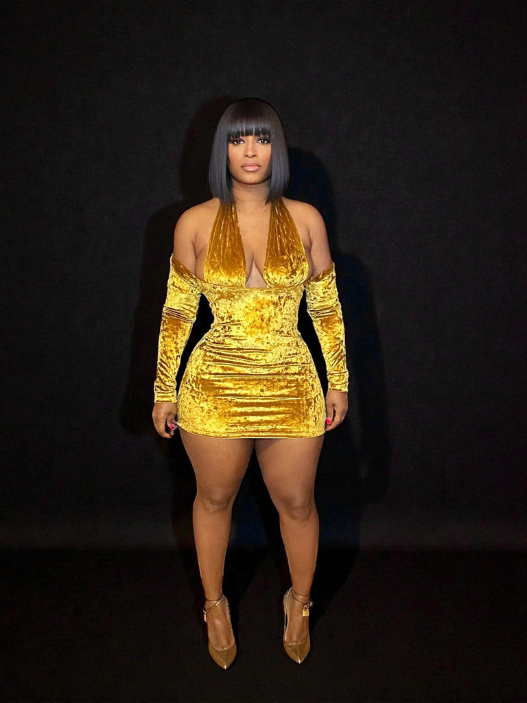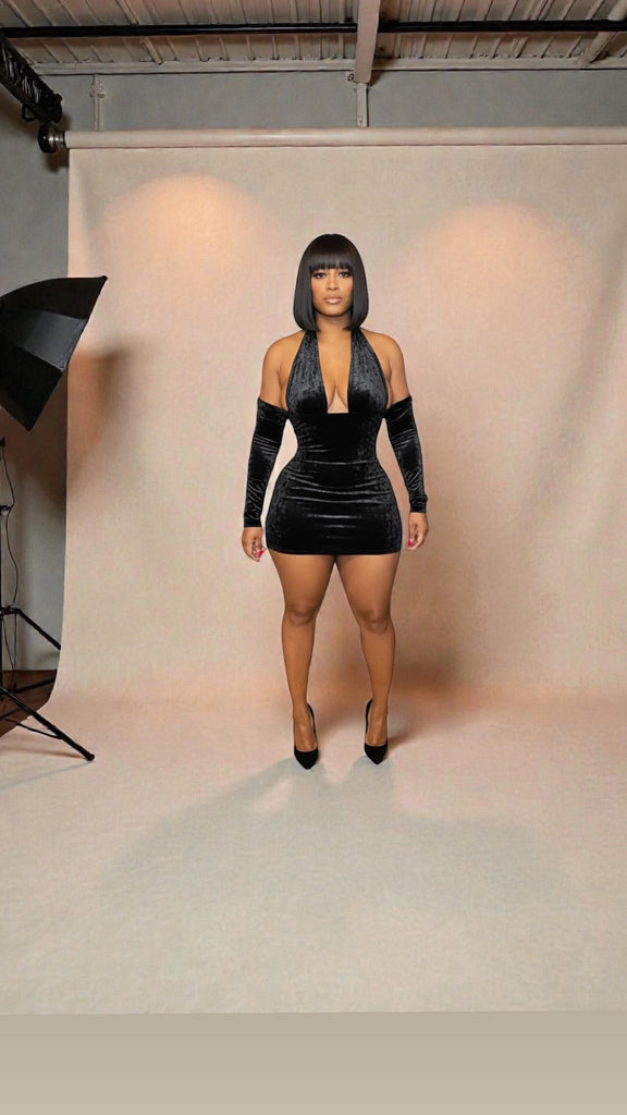 Crushed velvet dress with two panels that can be worn multiple ways with long sleeves. Very stretchy. Model is 5’7 and 195lbs wearing size medium. Please allow two business days to be made before shipping.