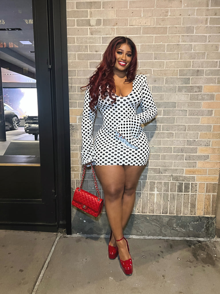 Body con mini dress with dramatic sleeves and shoulder pad. Very stretchy. Model wearing size large. Made to order