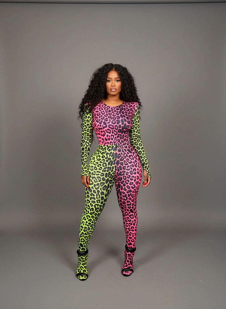 Two piece set in pink and lime green leopard . The pants are footed and very high waist. Very stretchy model is wearing size medium tall girl friendly. This item is made to order please allow two business days to be made before shipping out