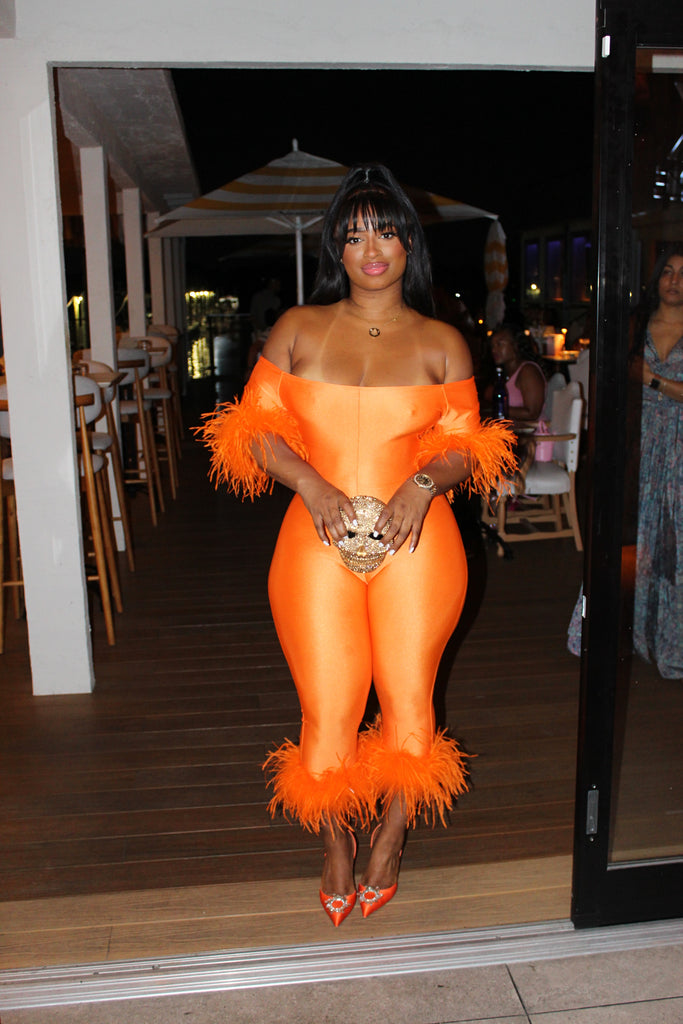Off the shoulder one pice jump suit with feather accent. Very stretchy and snatches the waist. Models are wearing g size large and small. Made to order please allow two business days to be made before shipping.
